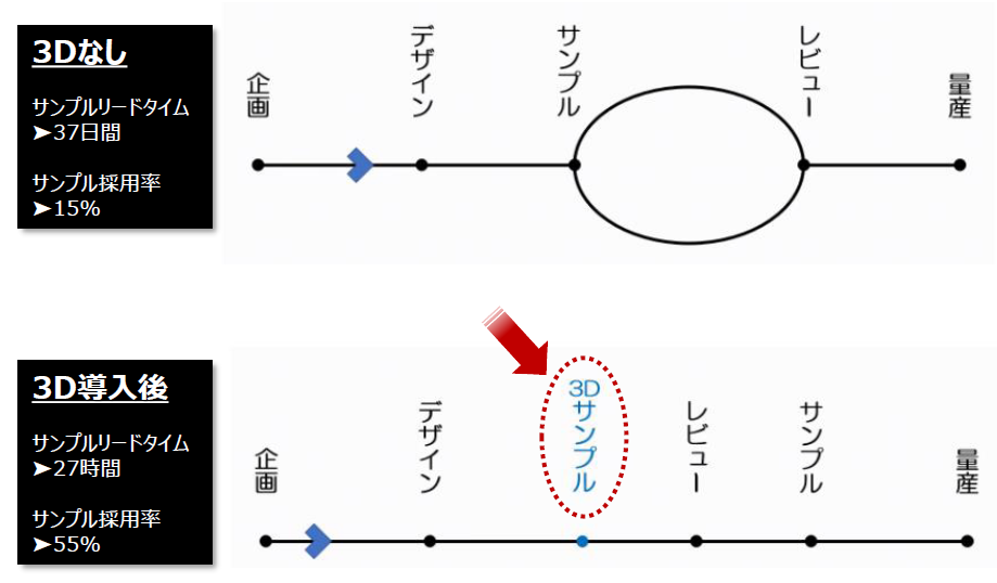 1つの商品が出来上がるまで、何度もサンプルを作成し修正を繰り返すため、サンプルの廃棄などの環境的な問題を始め、納期やコストの増大という課題があります。